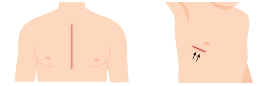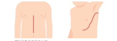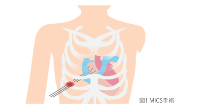 英語の頭文字をとってミックスと呼びます。通常の心臓手術は胸の真ん中を切開して行うのが標準的なやり方ですが、MICSでは、肋骨と肋骨の間を数センチほど切開して心臓手術を行います。