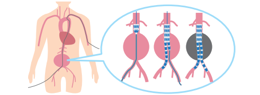 それに比べてステントグラフト治療は、患者さんの体の負担が少なく、御高齢の方や体力の低下した方にも大動脈瘤の治療が可能になります。