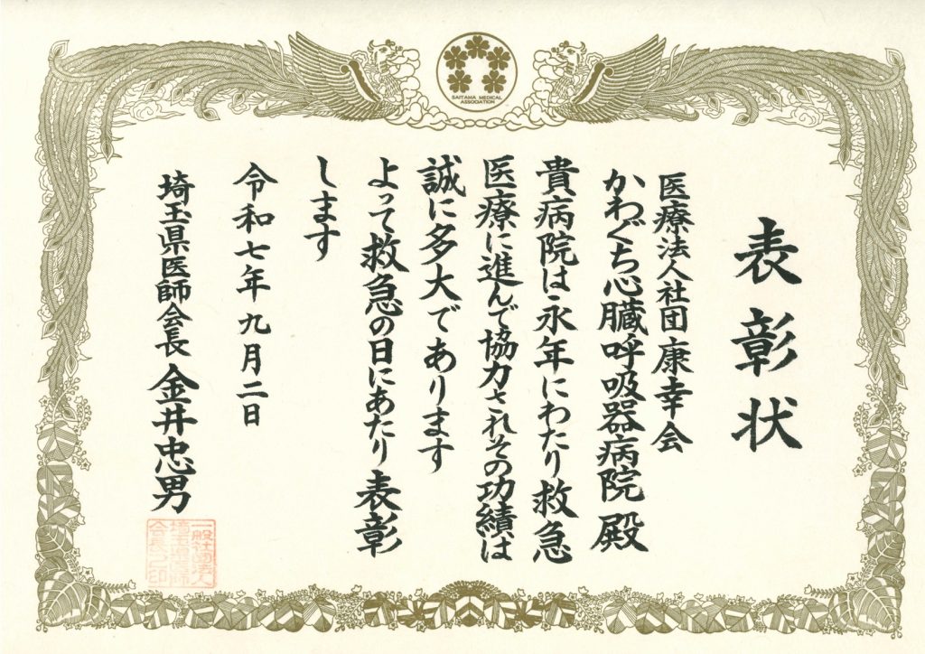 医療法人社団 康幸会 かわぐち心臓呼吸器病院が埼玉県知事表彰と埼玉県医師会表彰を授与しました。
