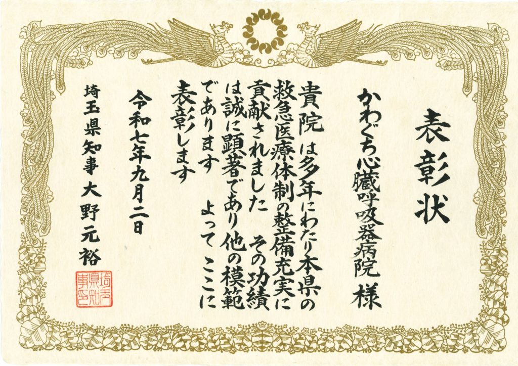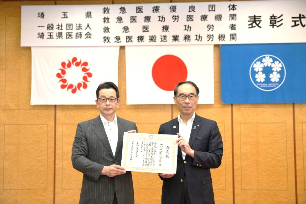 この表彰は、埼玉県と一般社団法人埼玉県医師会が共催で行う「救急の日(9月9日)」の記念行事にて、埼玉県内で救急医療対策の推進等、救急医療の確保に貢献した医療機関が表彰されます。