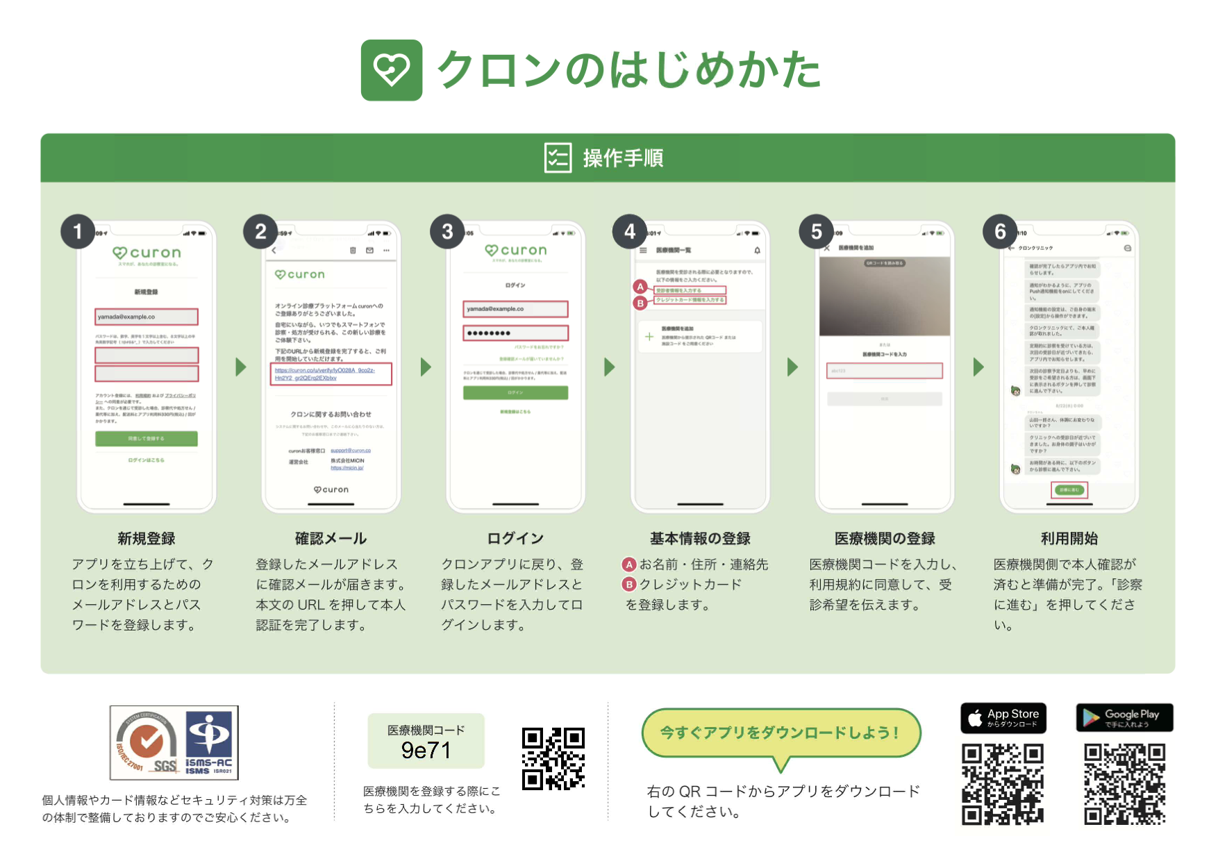 オンライン診療アプリcuronの公式ホームページを参考にアプリの初期設定を行ってください。医療機関を登録する際には、こちらの医療機関コードを入力するかQRコードを読み取ってください。